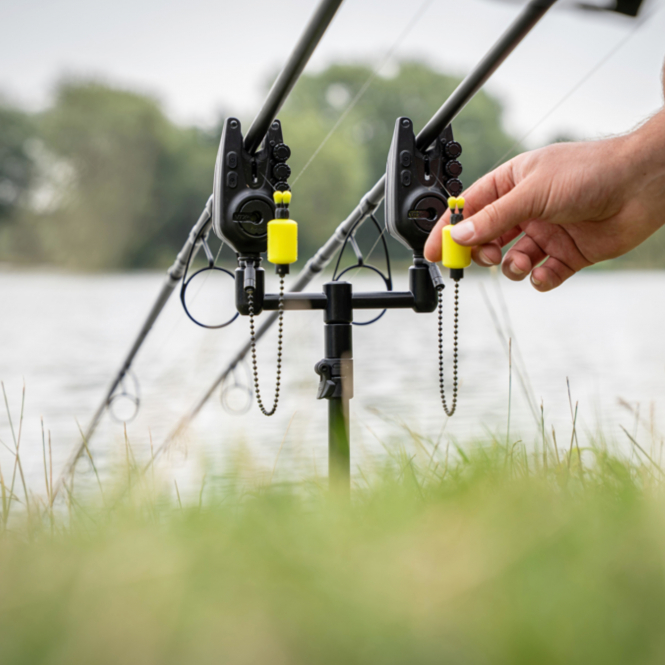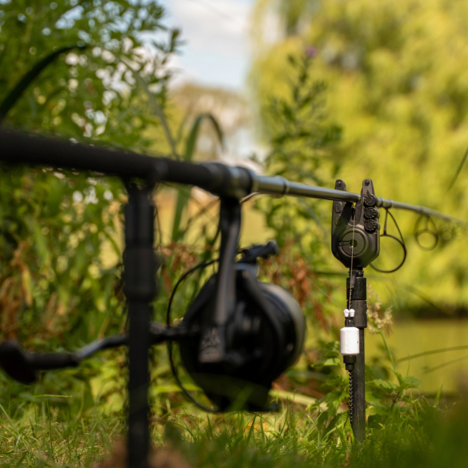 Der Alarm verfügt über Soft-Touch-Tasten zur Steuerung von Funktionen und LED-Einstellungen sowie separate Regler für Lautstärke, Ton und Sensibilität. Tiefe, gummierte Rutenauflagen halten die Rute auch unter schwierigen Bedingungen sicher in Position. Das starre 3/8"-No-Twist-Gewinde mit Verriegelungskragen sorgt für eine stabile, verdrehsichere Montage. Geliefert wird der Bissanzeiger mit einem robusten Clip-On-Hardcase und Schraubendreher, während Empfänger und Präsentationssets separat erhältlich sind. 2x AAA (nicht im Lieferumfang enthalten).