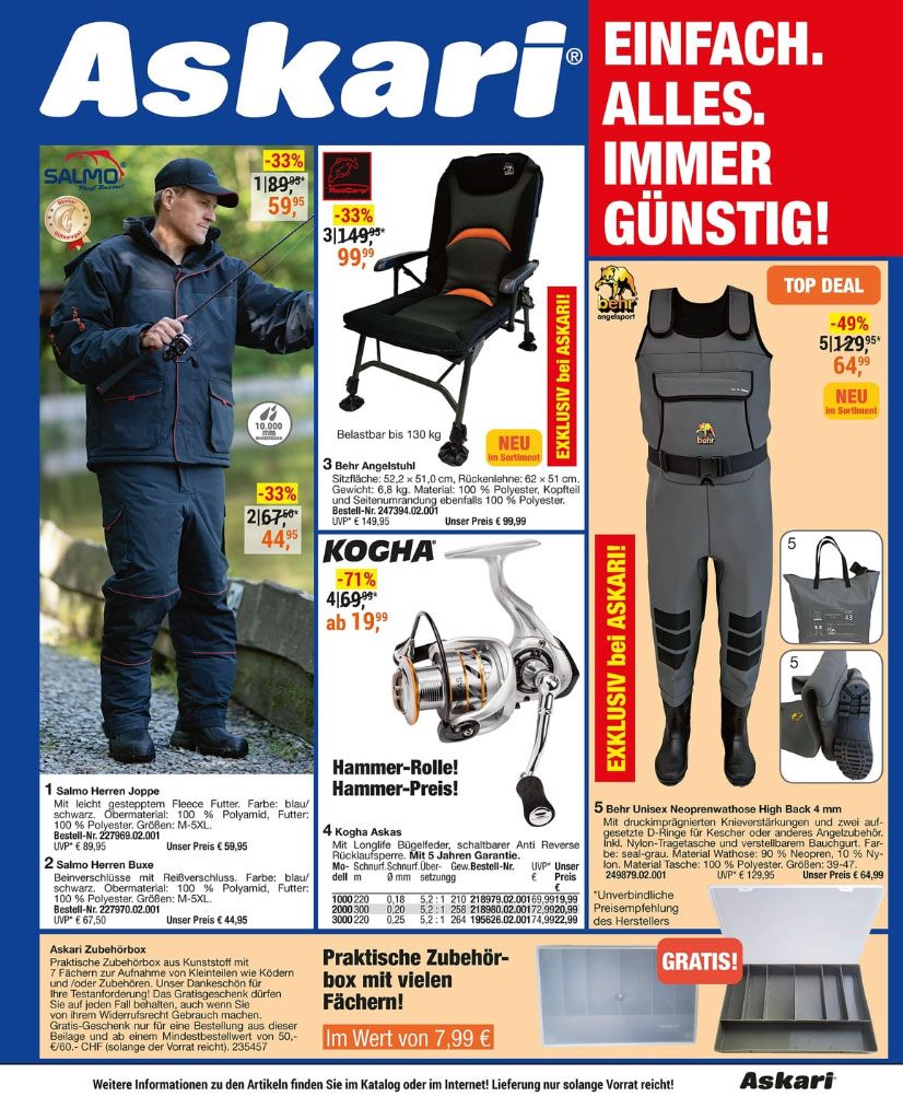 Auf über 640 Seiten finden Sie eine breite Vielfalt an Angelruten, Angelrollen und Angelzubehör zu fantastischen Preisen! Neben dem umfangreichen Angel-Sortiment bieten wir Ihnen auch eine riesen Auswahl an Outdoor-Bekleidung und Camping-Zubehör.
