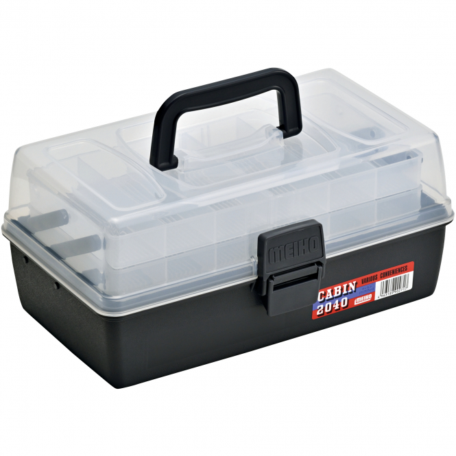 Kompakter, robuster Angelkoffer aus Kunststoff. Er besitzt eine zweistufige Ablageschale mit mehreren Fächern sowie einen großen Stauraum für größere Utensilien. Der Klappdeckel verfügt über einen sicheren Verschluss und einen praktischen Tragegriff für einfachen Transport. Maße: 30,5 x 19 x 14 cm.