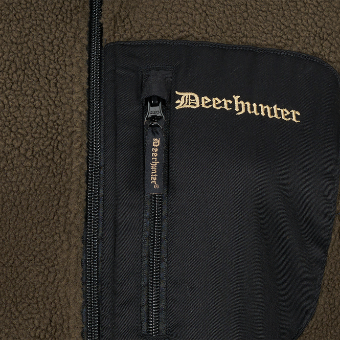Wärmender Komfort bei allen Outdoor-Aktivitäten. Hält an kühlen Morgen und kalten Tagen angenehm warm, schützt vor Wind und ist gleichzeitig atmungsaktiv. Mit winddichtem Reißverschluss und Kinnschutz sowie praktischen Brust- und Seitentaschen mit Reißverschluss. Verziert mit dem Deerhunter-Logo. Farbe: oliv.
