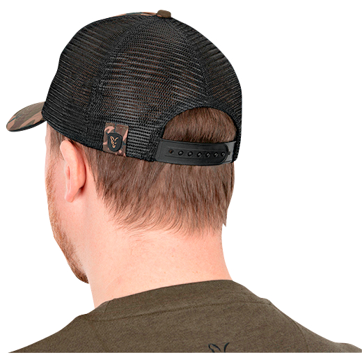 Kappe im Truckerstil. Mit schwarzem Gummidruck-Foxkopflogo. Farbe: Camotarn, Netz und Schirmunterseite schwarz.