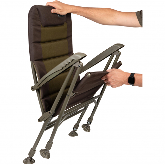 Ein weich gepolsterter Bezug und bequeme Armlehnen erhöhen den Sitzkomfort spürbar. Für den Transport lässt sich der Stuhl schnell und kompakt zusammenklappen, sodass er problemlos mitgeführt werden kann.