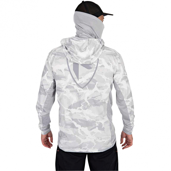 Hergestellt aus leichtem, atmungsaktivem Material. Das helle Camouflage-Design reflektiert die Sonnenstrahlen. UPF50-zertifiziertes Material. Mit belüfteten Seiteneinsätzen mit „R Shield”-Logo für verbesserte Luftzirkulation. Die elastische Kapuze bietet sicheren Schutz des gesamten Kopfes vor der Sonne, einschließlich Ohren und Nacken.