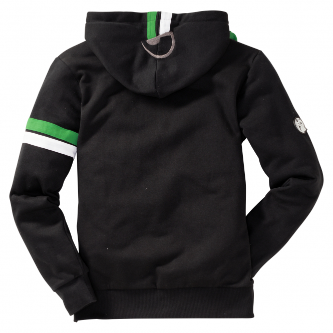 Sehr weiche, modische und sportliche Reißverschluss-Kapuzenjacke mit gerippten Bündchen und Saum sowie in bequemer Passform. Mit grünem und weißem Streifen auf dem linken Ärmel sowie Kapuze. Das Innere der Kapuze sowie die Zugbänder sind in Kontrastfarbe (grün) gearbeitet. Mit grauem und grünem Grafik- und Text-Aufdruck auf der Vorderseite sowie schwarzem Motivdruck im Inneren der Kapuze. Seitentaschen mit Reißverschluss. Farbe: schwarz.
