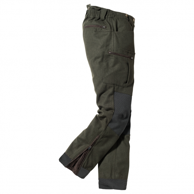 Lodenhose mit DWR-Imprägnierung. Mit Schutzbesätzen an den Innenseiten der unteren Bein-Abschnitte, als Einfassung an den mit Reißverschlüssen versehenen Beintaschen und Gesäßtaschen. Zwei weitere Einschubtaschen vorn bieten reichlich Platz. Der mit Gummizug ausgestattete Bund der Hose ist hinten etwas höher geschnitten und kann sowohl mit Gürtel als auch mit knöpfbaren Hosenträgern getragen werden. Lange Reißverschlüsse an den Außenseiten der Beine erleichtern den Ein- und Ausstieg. Farbe: oliv.