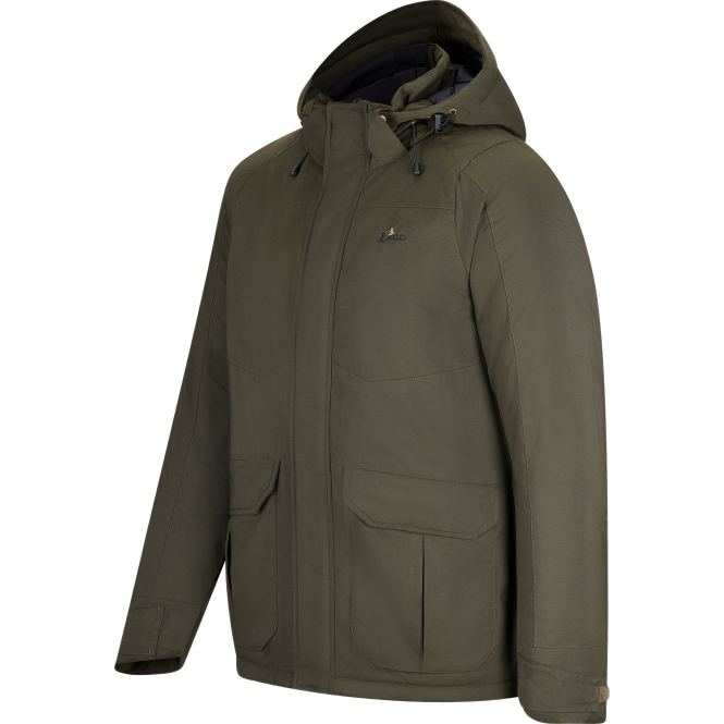 Dieser Jagdklassiker ist speziell für die Bedürfnisse aktiver Jäger entwickelt worden. Die Jacke besticht durch ihre verlängerte Rückenpartie, die zusätzlichen Schutz und Wärme bietet, sowie durch die abnehmbare Kapuze, die je nach Wetterlage flexibel eingesetzt werden kann. Mit zwei geräumigen Seitentaschen, die mit Druckknöpfen verschlossen werden, und einer Innentasche mit Reißverschluss bietet die Jacke reichlich Stauraum für alle wichtigen Utensilien. Die Farbe Oliv sorgt für eine optimale Tarnung in der Natur.