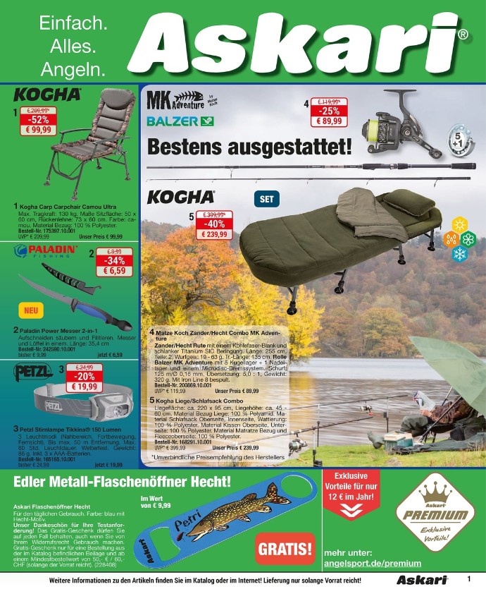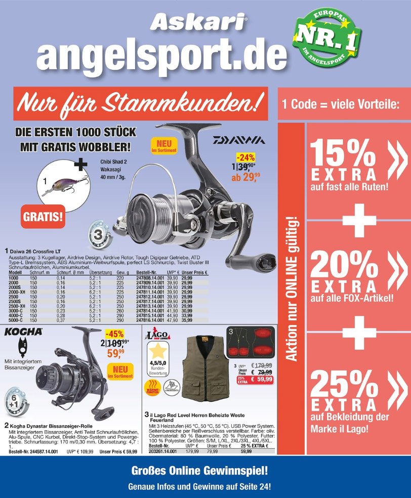 Auf über 640 Seiten finden Sie eine breite Vielfalt an Angelruten, Angelrollen und Angelzubehör zu fantastischen Preisen! Neben dem umfangreichen Angel-Sortiment bieten wir Ihnen auch eine riesen Auswahl an Outdoor-Bekleidung und Camping-Zubehör.