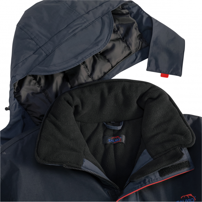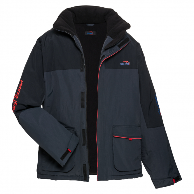 Mit der Salmo Joppe bist Du bestens gerüstet um auch an kalten, windigen und regnerischen Tagen am Wasser zu stehen. Nichts ist schlimmer beim Angeln als fröstelnd und nass auf den ersehnten Biss zu warten. Die Joppe im zweifarbigen Design ist aus robustem, strapazierfähigem Material gefertigt und schützt dank seiner Wasserdichtigkeit von 10.000 mm. Das warme leicht gesteppte Fleece Futter im Inneren sorgt für besonders angenehmen Tragekomfort und einem ausgeglichenen Klima, da es körpereigene Feuchtigkeit nach außen transportiert. Der hoch schließbare und ebenfalls mit Fleece gefütterte Kragen sowie die abnehmbare, gefütterte Kapuze mit Windschutzleiste und Schirm, sorgen ebenfalls für den nötigen Schutz. Die Ärmelbündchen sind mittels Klettverschlusses und der Jackensaum per Kordelzug regulierbar. Eine breite Windschutzleiste mit Klett-Fixierungen verhindert das Eindringen von Feuchtigkeit und Wind am stabilen Reißverschluss. Die aufgesetzten Klapptaschen wurden mit Einschubtaschen kombiniert und lassen sich, ebenso wie eine geräumige Innentasche, mittels Klett verschließen. Optisch runden die praktischen Salmo-Zipper-Puller sowie der aufgedruckte "Salmo Fängt Bessser!" Slogan das Erscheinungsbild ab. Farbe: blau/schwarz.